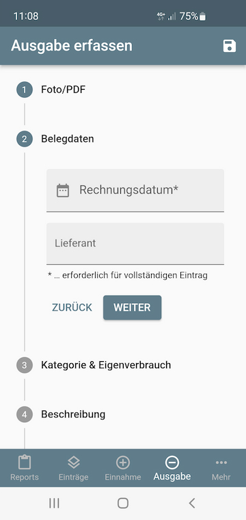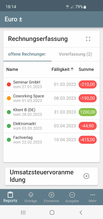 No time and no desire to sit down for “accounting” after the actual work or in the evening or on weekends? You always have your mobile phone with you, with eurplusminus this also applies to your income and expenditure invoice. Photograph and pre-capture receipts from anywhere and complete the entries whenever you have the time. You can also access your income-expenditure invoice from your work corner on the computer via the web access.
